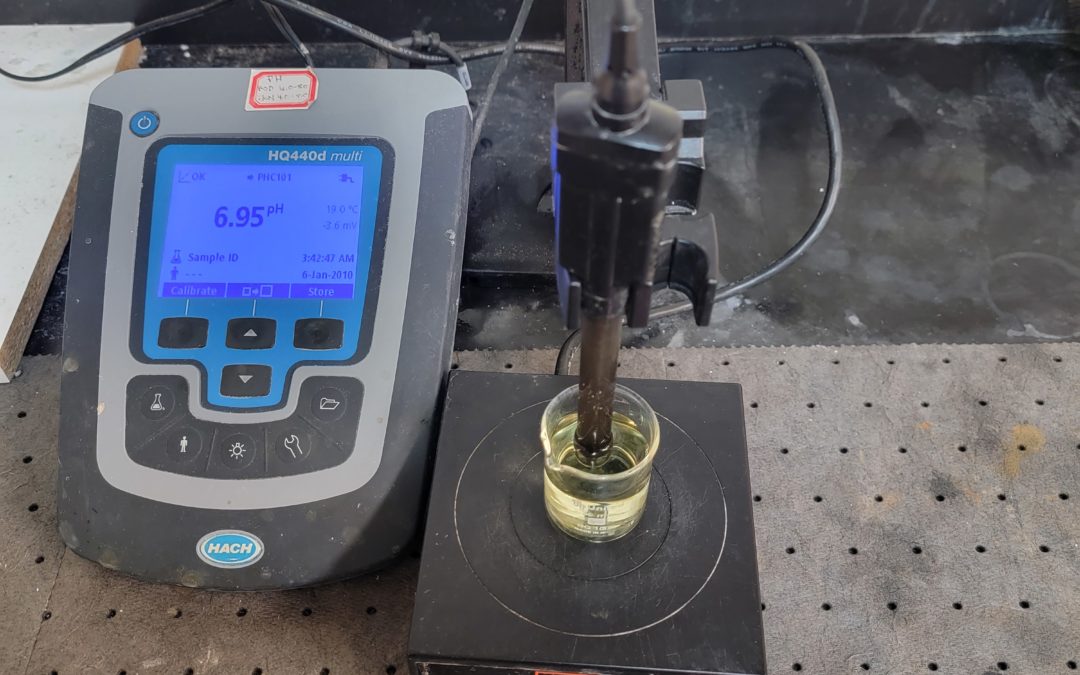pH approximates the concentration of hydrogen ions in a solution. The pH value is the negative logarithm (base 10) of the concentration of H+ ions in the solution. In the laboratory, pH is measured by electrometric pH measurement which is the determination of the activity of the hydrogen ions by potentiometric measurement using a standard hydrogen electrode and a reference electrode. The pH probe is placed in the sample (while stirring) and the number is recorded once the readings have stabilized. Because it is on a logarithmic scale, it will take ten times as much acid or base (caustic) to raise or lower the pH two units as it did to raise or lower it one unit. For example, if it takes 10 gallons of a particular acid to lower the pH of an influent from 10 to a pH of 9, it will take 100 gallons to lower it from a pH of 10 to a pH of 8.